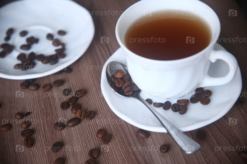 Чашка черного кофе с бобами на столе