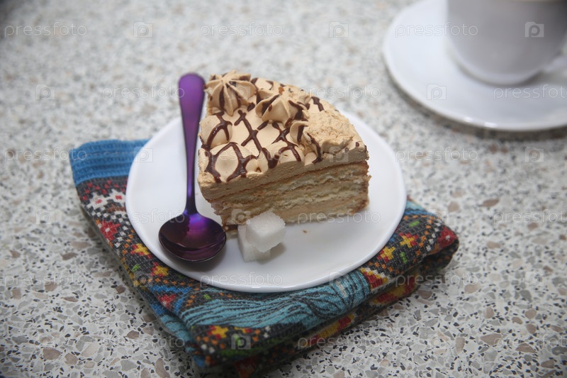 Кусок карамельного торта с шоколадной глазуркой на столе