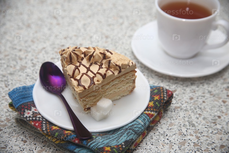 Кусок карамельного торта с шоколадной глазуркой на столе