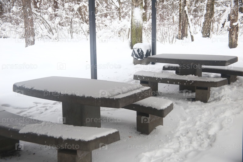 Зимний пейзаж с деревьями и столами для барбекю