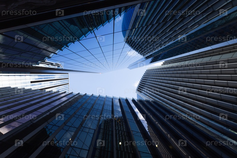 Широковольный низкоугольный снимок современных стеклянных небоскребов, достигающих чистого синего неба в оживленном корпоративном финансовом районе