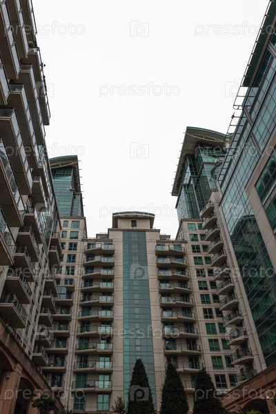 Перспективный вид на современные многоэтажные здания со стеклянными фасадами и многими балконами под облачным небом