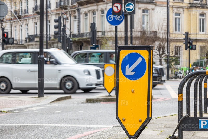 Желтый левый столб стоит на переднем плане оживленной лондонской улицы, где белое электрическое такси пересекает многополосный перекресток