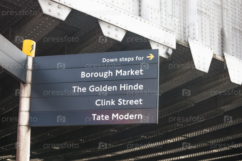 Черный уличный знак в Лондоне, указывающий на Borough Market, Golden Hindoo, Klink Street и Tate Modern под железнодорожным мостом