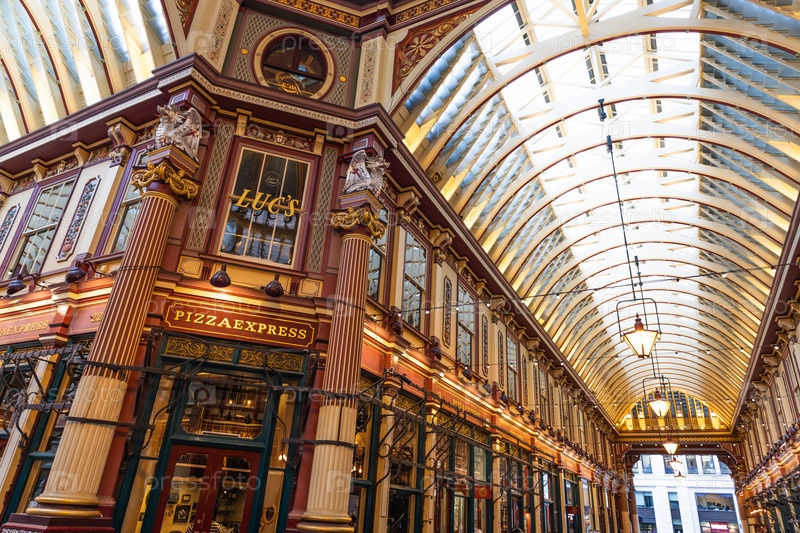 Потрясающий вид на исторический рынок Лиденхолл в Лондоне, демонстрирующий его украшенную викторианскую архитектуру и знаковый дизайн сводчатой стеклянной крыши