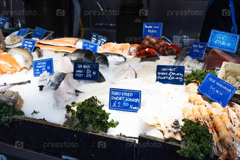 Сырая рыба и моллюски на лондонском продовольственном рынке