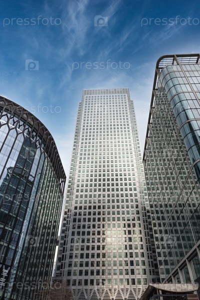 Низкоугольные виды высоких небоскребов в Канарском вокзале, Лондон.Функции One Canada Plaza против Blue Sky, финансовый район Великобритании