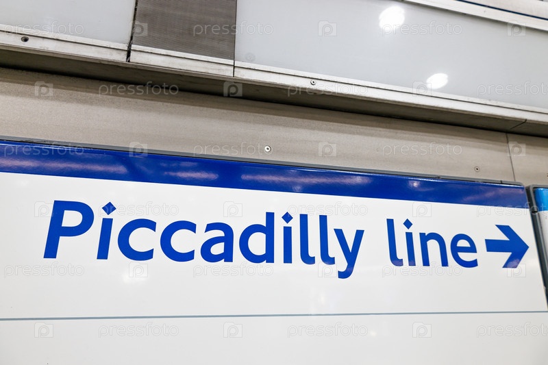 Закрытие знака Piccadilly Line в лондонском метро Синий текст на белом с направленной стрелкой, ведущей пассажиров по сети метро