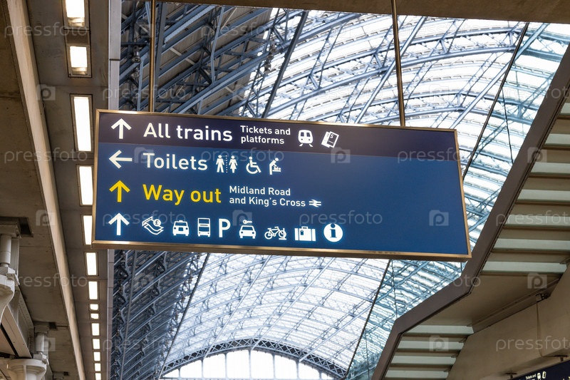 Синий знак на международной станции Сент-Панкрас в Лондоне, показывающий направление к поездам, туалетам и выходам