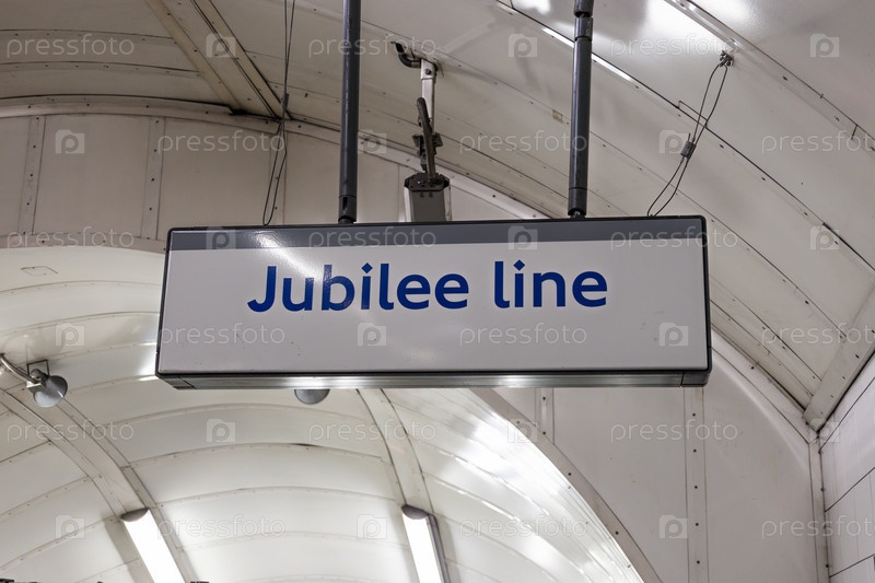 Висящий знак юбилейной линии внутри тоннеля лондонской станции метро с изогнутым белым черепичным потолком и освещением