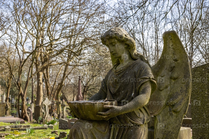 Статуя каменного ангела с крыльями, держащего бассейн на старом готическом кладбище.Историческая скульптура стоит среди безлистных деревьев и надгробий в мягком свете, Лондон, Великобритания