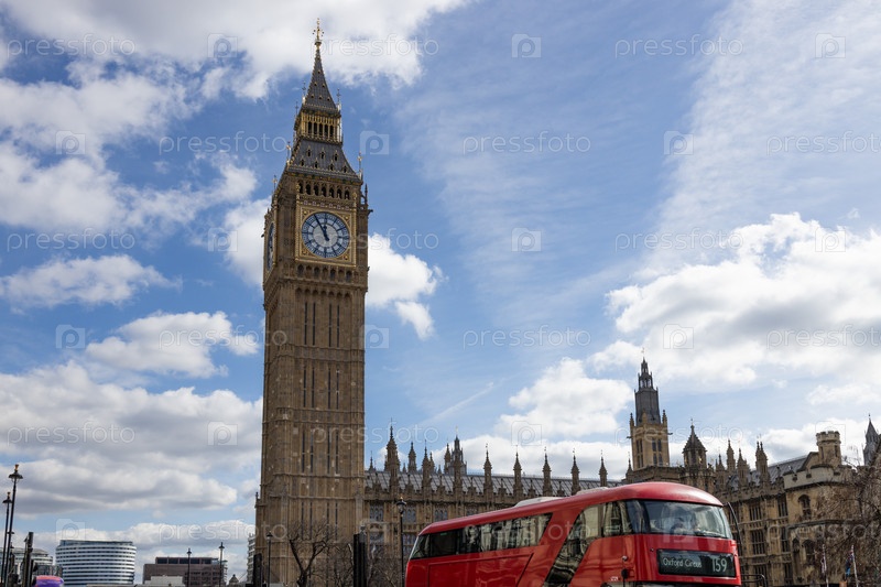 Знаменитая лондонская достопримечательность с Элизабетской башней, историческими зданиями парламента и классическим британским общественным транспортом на оживленной улице города