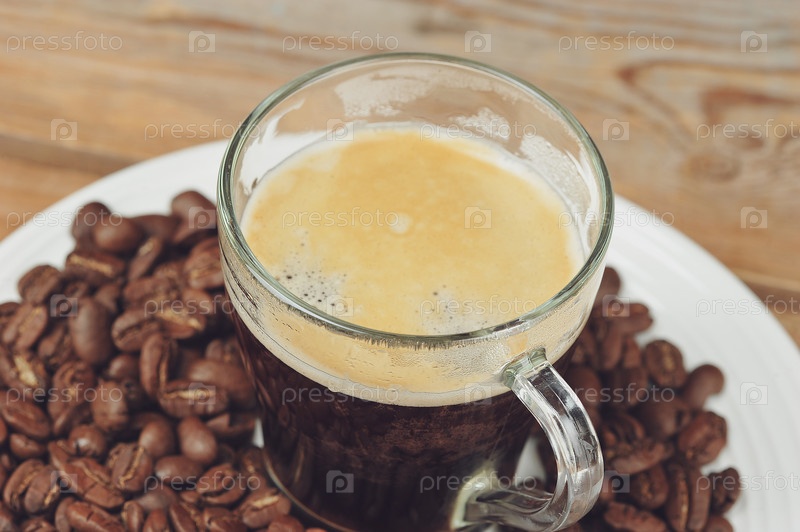 Эспрессо в стеклянной кружке на фоне кофе