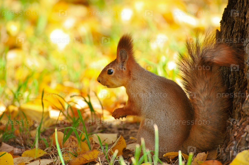 Белка сидит на листьях в парке в Москве