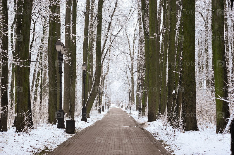 Зимний пейзаж в парке - заснеженные тропы
