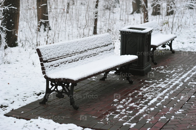 Заснеженная скамейка в парке Царицыно в Москве
