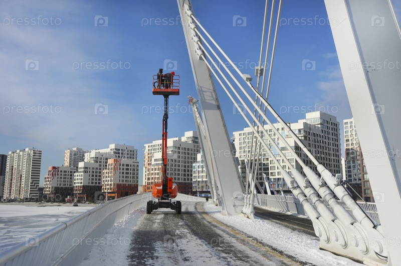 Рабочие работают на лифте на мосту через Нагатинский замок в Москве