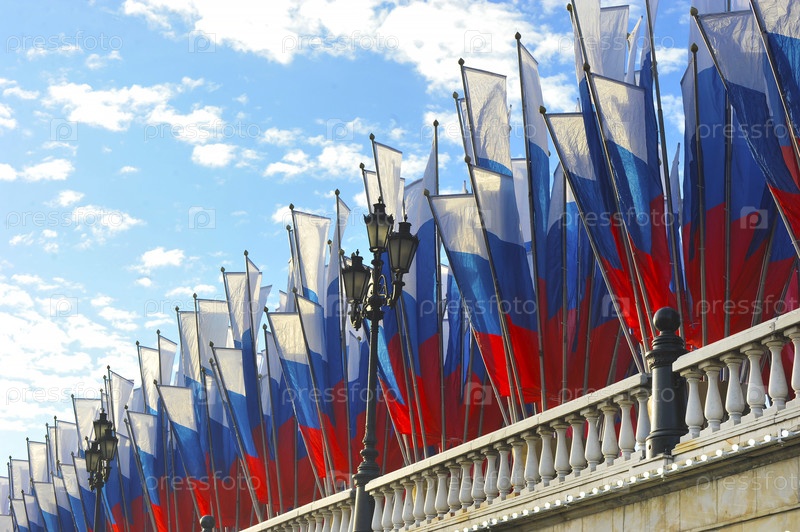 Праздничное украшение с российскими флагами на Манежской площади в Москве