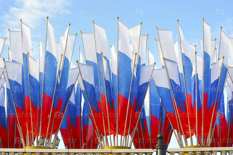 Праздничное украшение с российскими флагами на Манежской площади в Москве