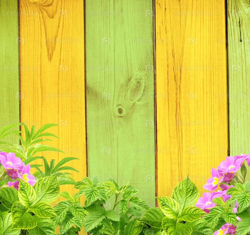 Фрагмент забора, цветы и зеленые листья