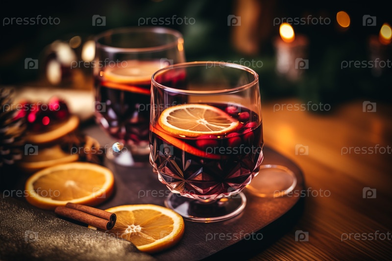 Два стакана традиционного горячего вина с апельсиновыми и клюквенными блюдами на уютном рождественском столе.Фон размыт огнями боке и свечами, создавая теплую и праздничную атмосферу