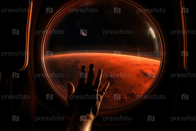 Марсианский пейзаж виден через окно космического аппарата с рукой астронавта, касающейся стекла.Концепция внеземного путешествия в космос, передающая ощущение потусторонней красоты и чуда