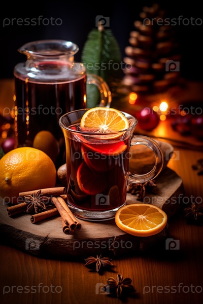 Стакан традиционного горячего вина с апельсиновыми и клюквенными блюдами на уютном рождественском столе.Фон размыт огнями боке и свечами, создавая теплую и праздничную атмосферу