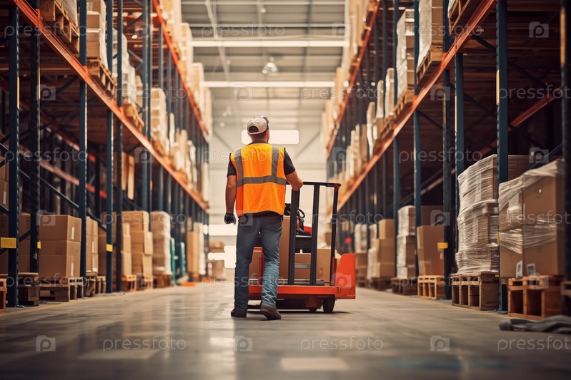 Работник в отражающем жилете управляет вилочным погрузчиком на хорошо освещенном складе, перемещаясь через проходы, заполненные упакованными товарами.Эффективность и организация современного дистрибьюторского центра