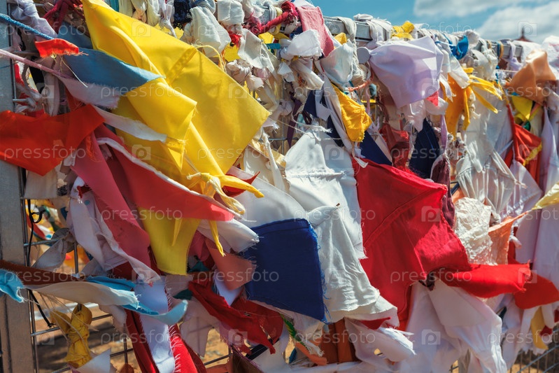 Многоцветная ткань размахивает флагами в буддийском храме Ruvanvelisei Dagoba.Анурадхапура, Шри-Ланка