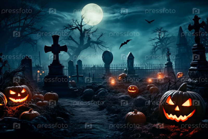 Концепция Хэллоуина - это жуткое кладбище ночью в полнолуние с фонариком, тыквы на Хеллоуин со светящимися глазами, могилы и надгробия
