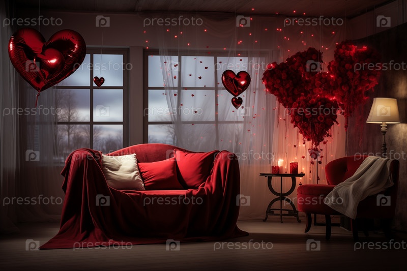 Уютная гостиная, украшенная декорациями на День святого Валентина, с розовыми воздушными шарами, букетом роз и свечами создает романтическую атмосферу