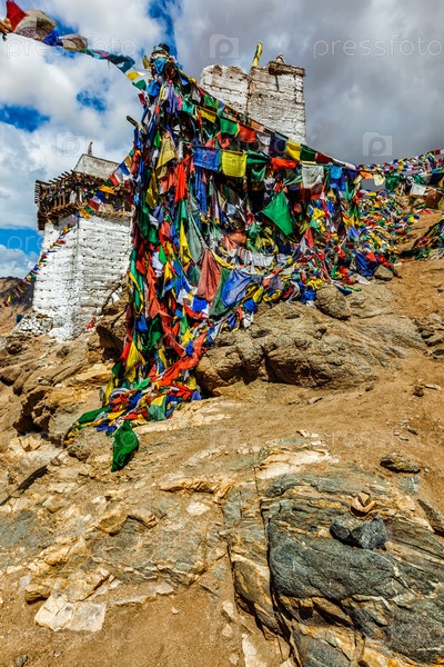 Руины форта Цемо на скале холма Намгьял и красочные буддийские молитвенные флаги с написанной на них буддийской мантрой