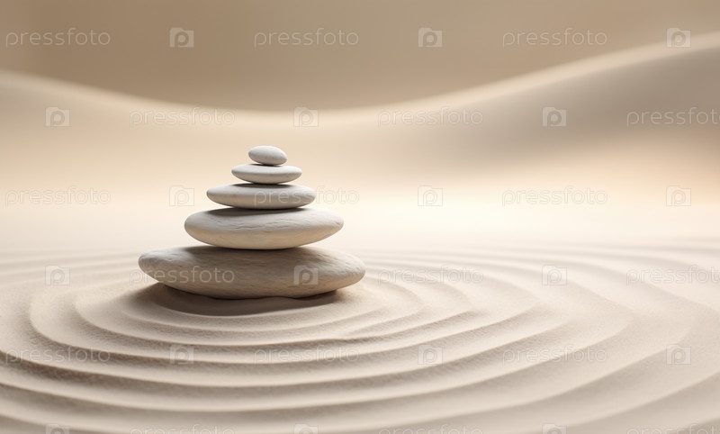 Дзен-камни складываются в песок в минималистической обстановке для равновесия и гармонии. баланс, гармония и спокойствие ума, здоровье, медитация и концепция духовности