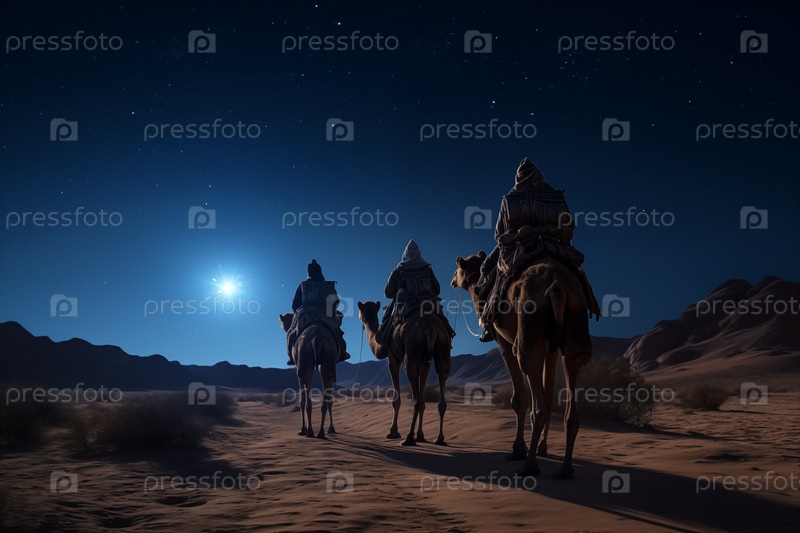 Рождественская концепция рождения Иисуса - Поклонение волхвам, трем мудрецам, трем царям и трём библейским волшебникам с силуэтами верблюдов, путешествующих по песчаным дюнам пустыни, следует за звездой Вифлеема ночью