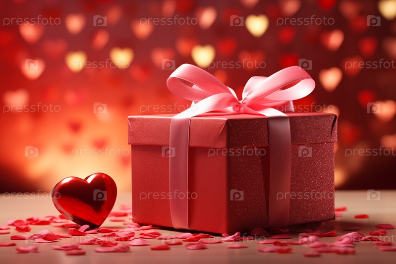 Valentina Gift Red Gift Box, украшенная мягкой розовой лентой, окруженной конфети в форме сердца и фоном боке