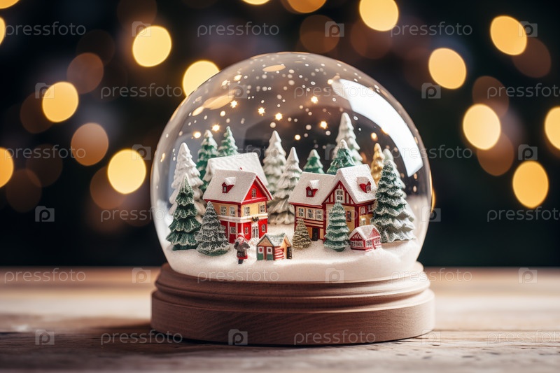 Зимняя страна чудес с домом и деревьями в стеклянном шаре Снежный шар на столе и размытый фон боке