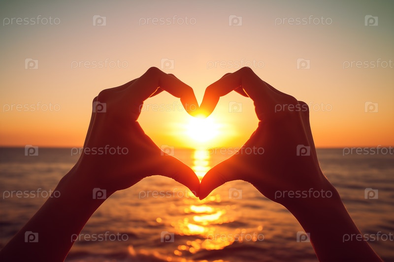 Две руки в форме сердца, вытянутые на фоне захватывающего заката океана.Любовь и тепло на День святого Валентина или любое романтическое событие