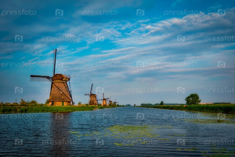 Голландский сельский пейзаж с ветряными мельницами на знаменитом туристическом месте Kinderdijk в Нидерландах при закате солнца с драматическим небом
