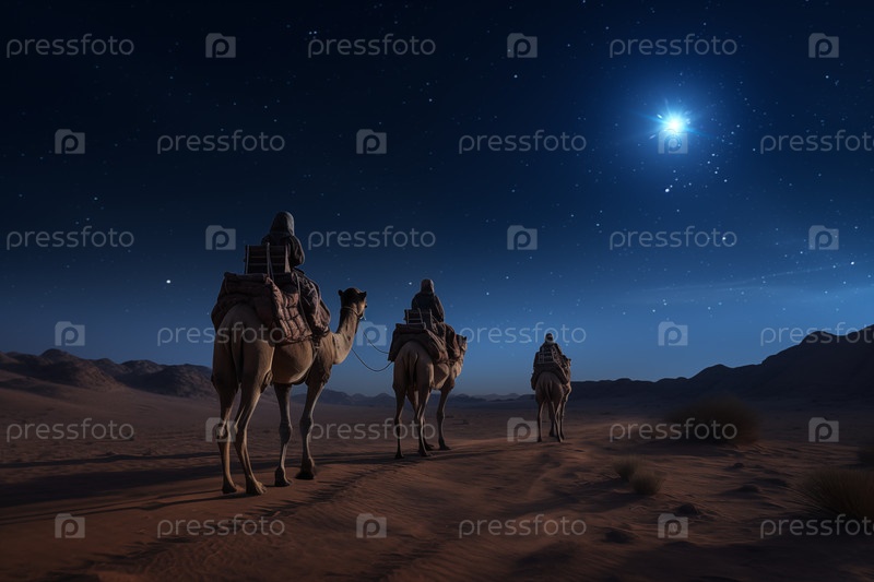 Рождественская концепция рождения Иисуса - Поклонение волхвам, трем мудрецам, трем царям и трём библейским волшебникам с силуэтами верблюдов, путешествующих по песчаным дюнам пустыни, следует за звездой Вифлеема ночью