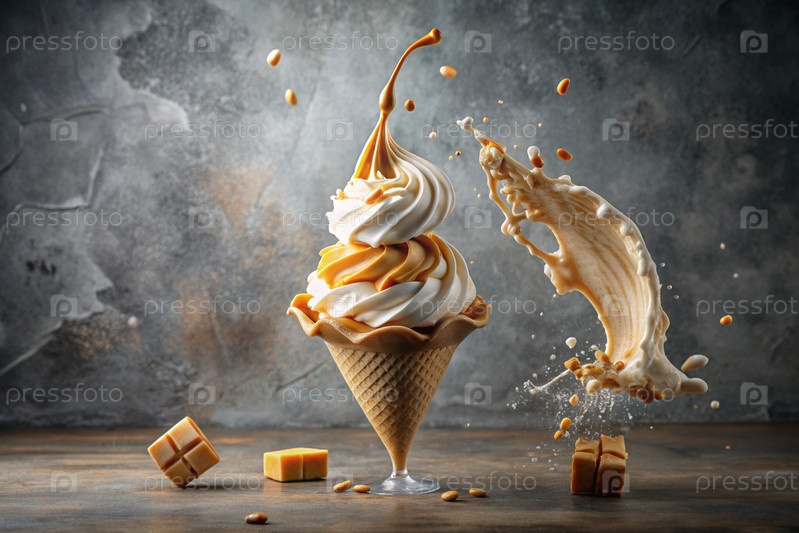 сладкий десерт. мороженое с ароматизированным карамелем. белое ванильное мороженое на фоне серых тонов. карамэль, капающий в мороженом