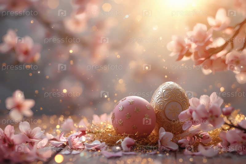 Концепция яркого пасхального праздника в 2026 году.Концепция ярких пасхальных праздников.Нежные розовые пасхальные яйца и вишневые ветви на деревянном фоне
