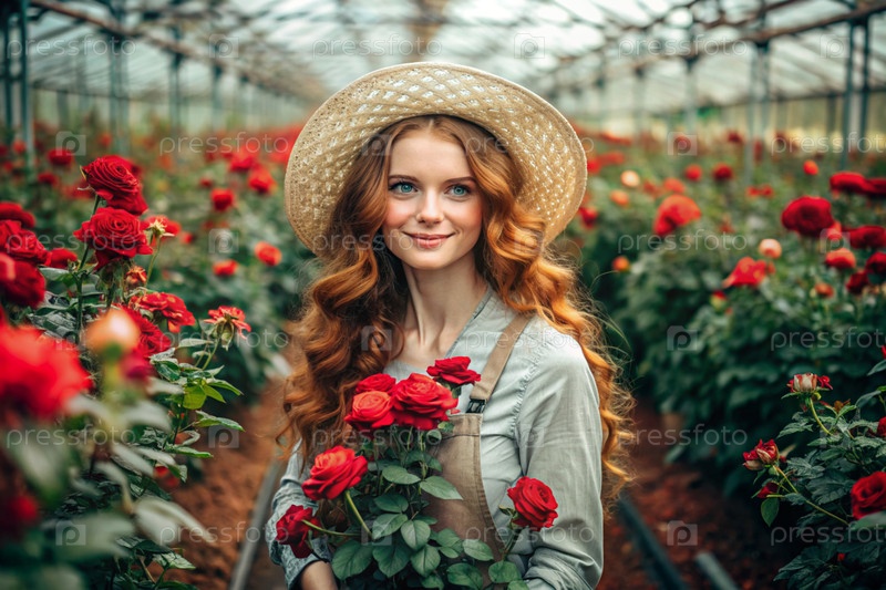 Портрет красивого садовника с рыжими волосами в соломенной шляпе, работающего с розами в стеклянной теплице