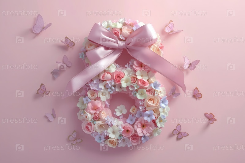 Международный женский день. баннер, флаер, красивая открытка на 8 марта. цветы в форме цифры восемь и бабочки на розовом фоне