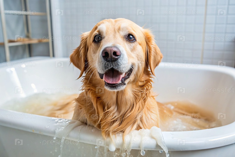 Золотой ретривер купается в пузырьковой ванне. Помыть собаку. Концепция ухода за домашними животными