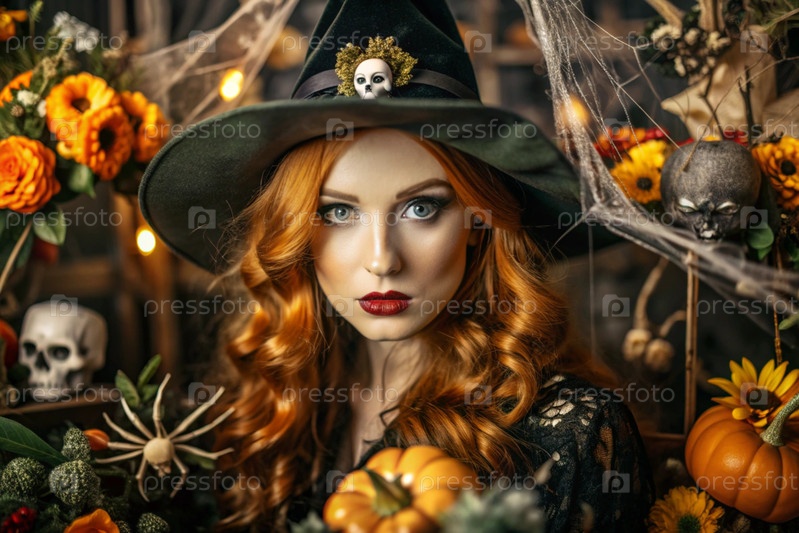 Концепция Хэллоуина. Ужасное. Костюмированная вечеринка. Красивая женщина в костюме ведьмы. Баннер, открытка
