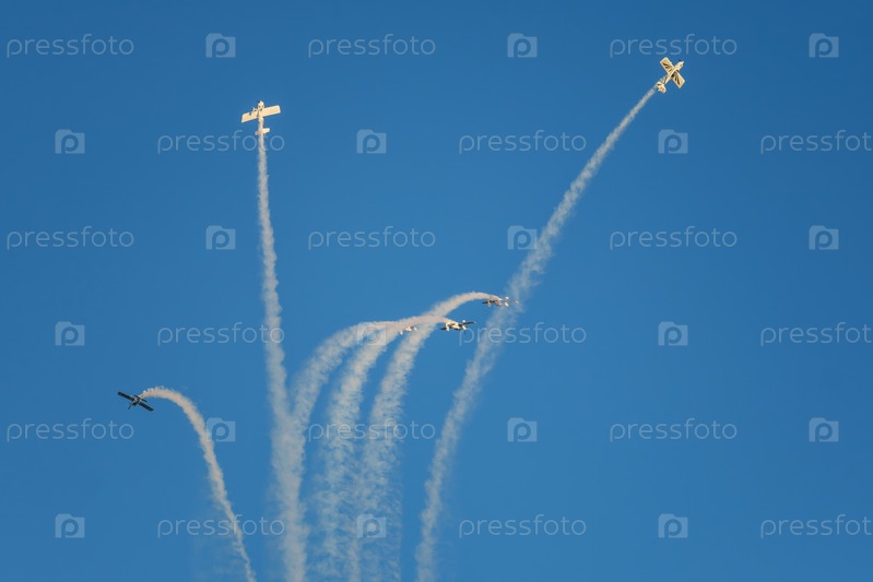 Аэробатические самолеты выполняют трюки в голубом небе с дымовыми следами.Концепция командной работы, сотрудничества, координации, доверия, точности, сложности, вызова, скорости и синергии