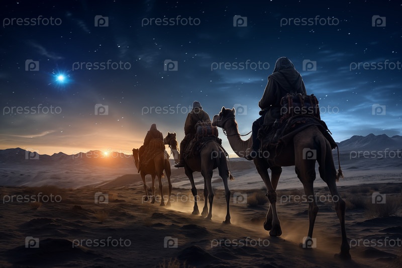 Рождественская концепция рождения Иисуса - Поклонение волхвам, трем мудрецам, трем царям и трём библейским волшебникам с силуэтами верблюдов, путешествующих по песчаным дюнам пустыни, следует за звездой Вифлеема ночью