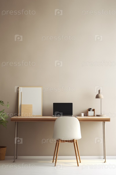 Чистый и элегантный домашний офис с деревянным столом с ноутбуком, художественными рамками и современным декором на нейтральной стене