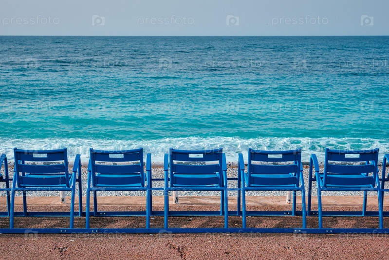 Знаменитые синие стулья на пляже Ниццы, Франция