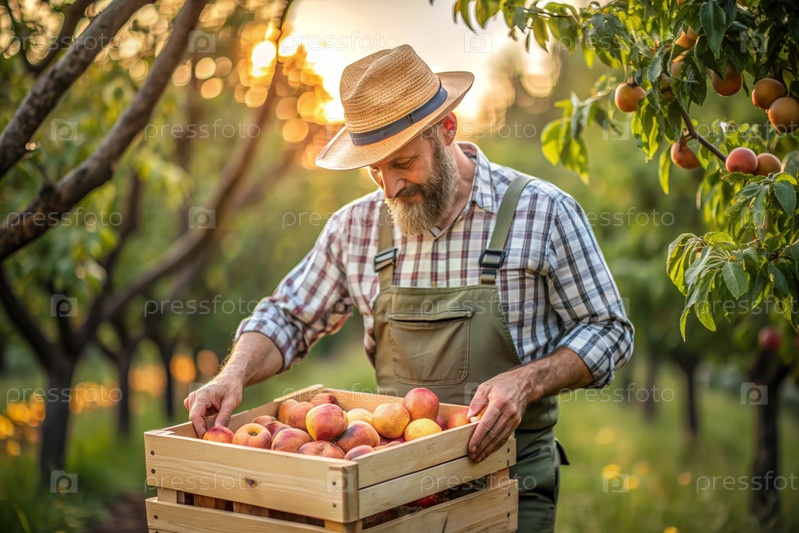 Сельскохозяйственная промышленность. Деревянный ящик с персиками в руках фермера-мужчины. Садовник собирает богатый урожай. Ближе, солнечный свет. Осенний урожай фруктов